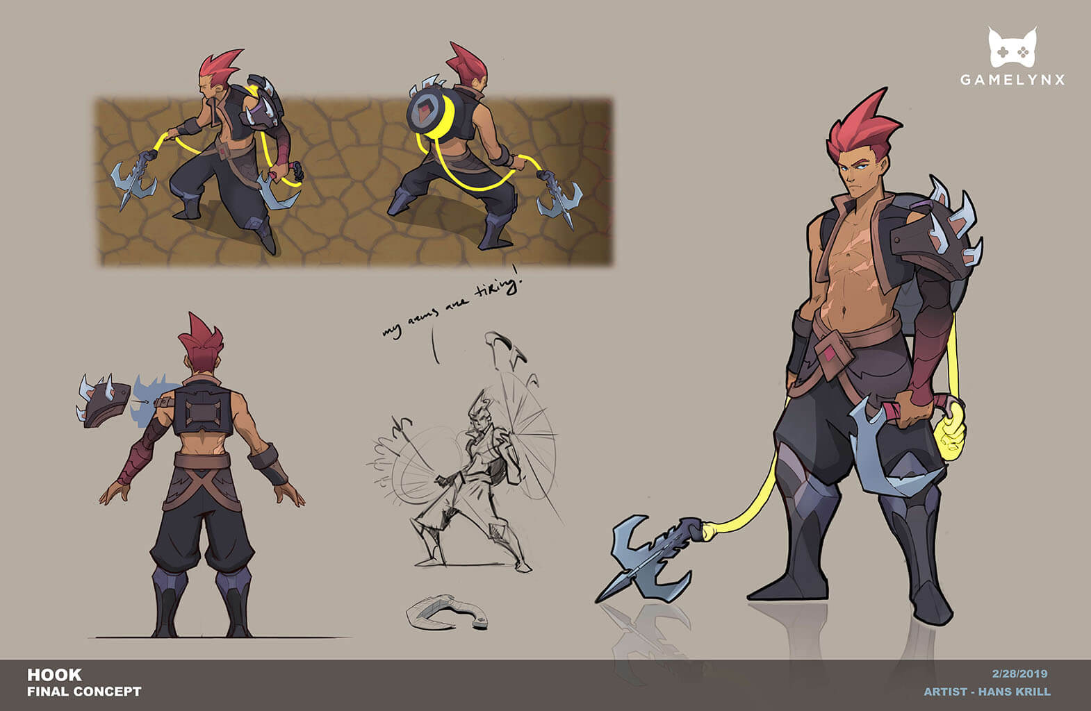 Hook characters are typically tough hulking characters like Pudge, Blitzcrank, and Roadhog. They use their hook to yank players close and finish them before they get away. My contribution to the design space was to turn that tanky archetype on it's head. The goal was to make an mobile skirmisher would pull you in but then they were the ones who wanted to get away after!