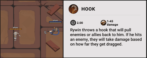 So it was obvious the ranged ability would the be the classic hook from MOBA games. It pulls enemies in and damages them based on distance dragged. It can also pull allies for no damage. The hook would be the central starting point to their offensive attacks.