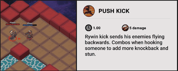 - Push Kick, a barely damaging attack that pushes away enemies. Empowers when comboed with the Hook to push further and add a small bit of stun.