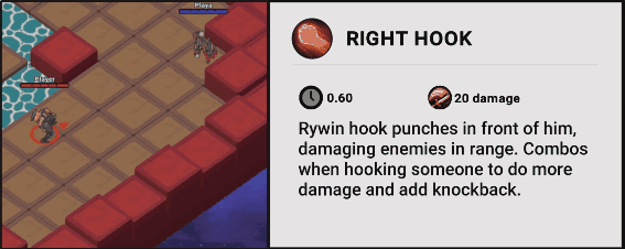 - Right Hook, a weak melee attack that gets empowered with slight knockback when comboed with the Hook
