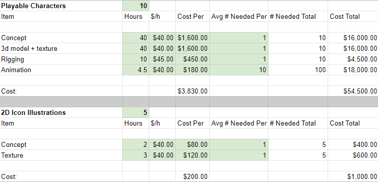 If you were able to get the right people, at the right going rate, to make all the pieces of art--how much would that cost? We didn't want to spend our funding on making non-essential art just cause we had artists on staff (and we didn't want to have to lay them off, either). Leveraging our production plan, we used a rough estimate of the art categories and the average costs associated to estimate our full costs from the bottom up.