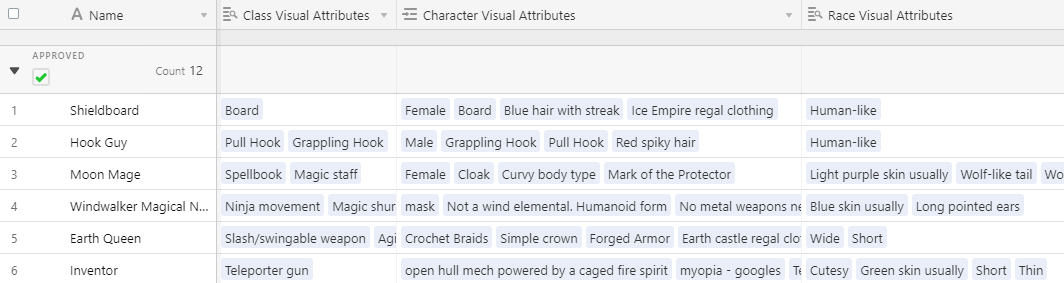 The extra benefit of the Airtable, is that it's very easy for people to brainstorm and add ideas. We simply had an Approved for Production checkbox to clean up views, and outside of that, anyone on the team could suggest extra ideas for characters or world building elements.