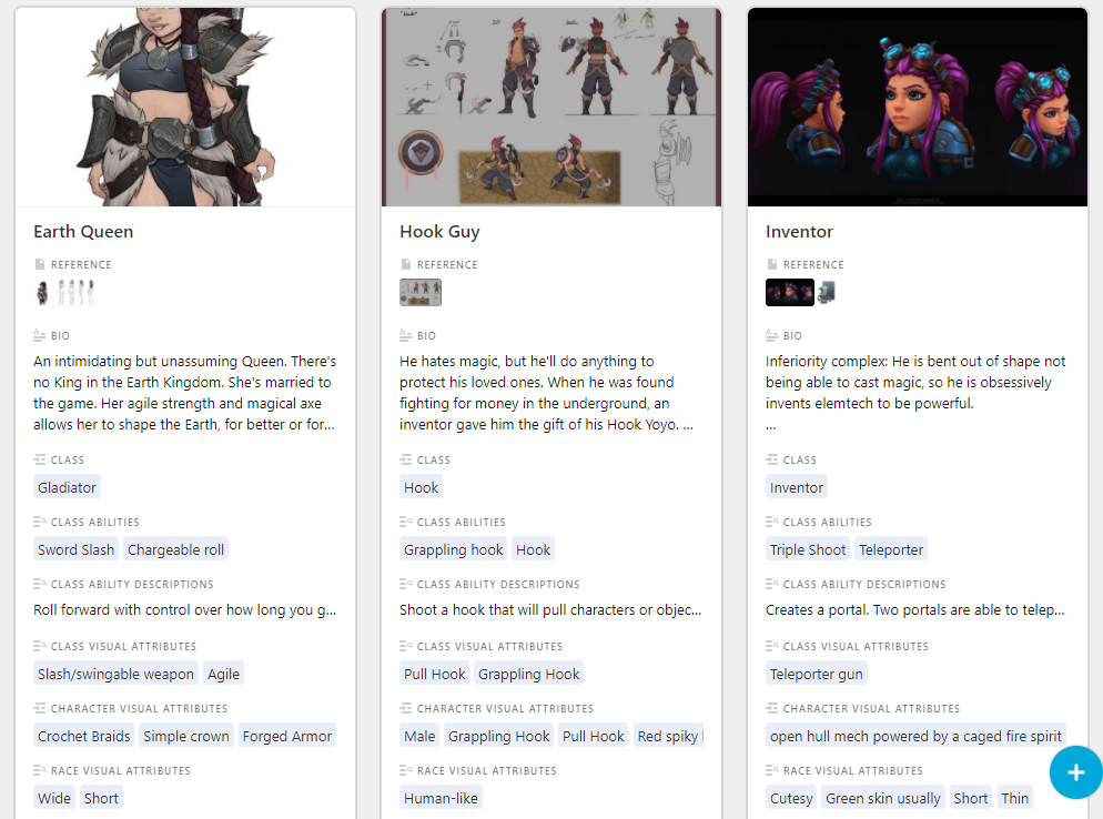 To manage these requirements and to quickly generate art briefs, I created a Dungeons and Dragons inspired character creator tool in Airtable. You could quickly select from dropdowns the Characters Background, Race, Class, Armor Type, Faction, Alignment, and more. Afterwards, the key details artists needed to keep in mind would auto-populate. I coupled that with a bio, descriptions of the unique elements this character has, and very targeted reference (2-5 pieces). And then I let the artists run with it.